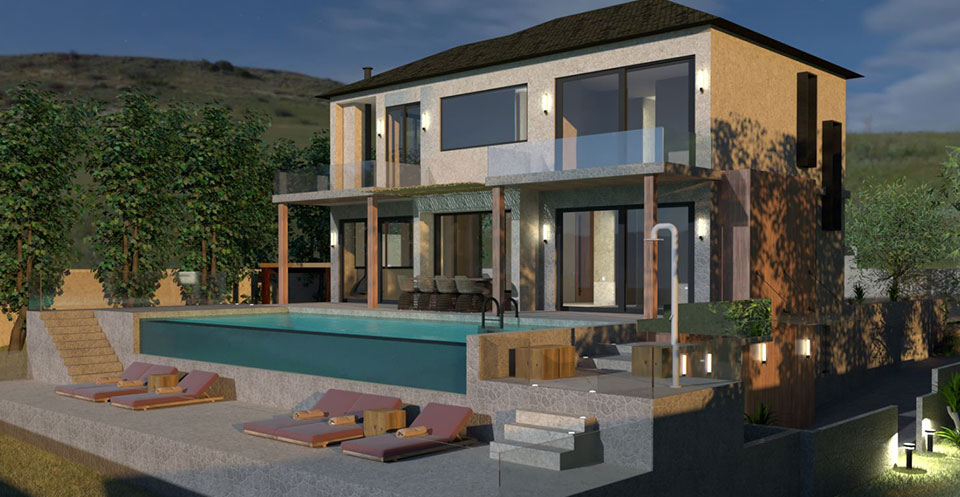 Currently, in the final stages of completion, Casa Oropos comprises two exquisitely designed residences. The main residence, spanning 149.37 sqm, features a master en-suite bedroom with a free-standing tub and an additional bedroom, both with well-appointed bathrooms. The open-plan design seamlessly integrates the living room, kitchen, and dining room, creating a visual connection throughout. Large windows fill the space with natural light, offering direct access to the swimming pool area. A suspended fireplace acts as a centerpiece of comfort and warmth. The secondary residence, covering 115.93 sqm, situated on the lower level, offers two bedrooms, two bathrooms, and versatile living spaces ideal for relaxation or entertainment.